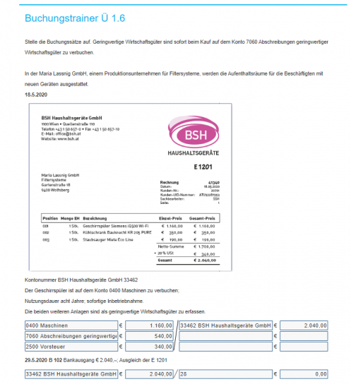 Ab den Auflagen 2019 ist nun in jedem Buchungstrainer die komplette Angabe inklusive Belegen angeführt. Somit muss man das aufgeschlagene Buch nicht mehr neben sich liegen haben.