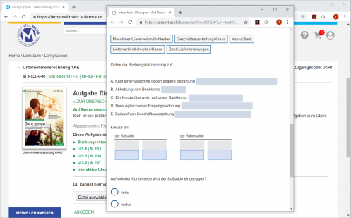 Alle Übungsbeispiele mit Buchungen, wahlweise auch kombinierbar mit eigenen Inhalten, können im Lernraum als Übung oder Hausaufgabe aufgegeben werden. Automatische Aufgaben- und Abgabekontrollen erleichtern die Korrekturarbeit.