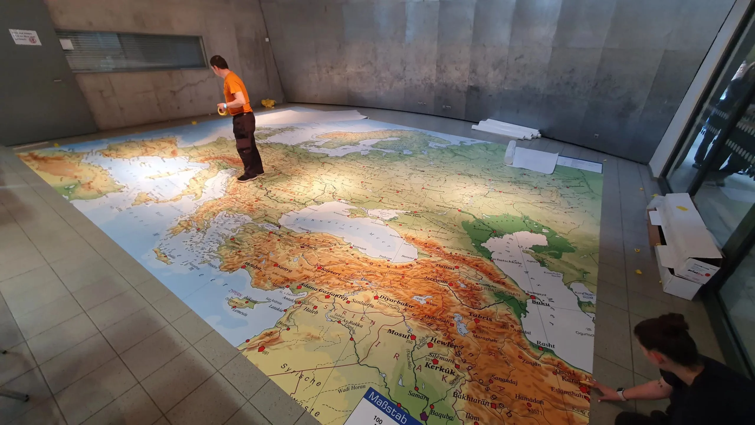 Die topografische Karte von Europa, die sich nun aufgebläht über rund 60 Quadratmeter Bodenfläche erstreckt, ist nahezu exakt dieselbe Karte, welche die Schüler und Schülerinnen in ihrem Hölzel-Schulatlas vorfinden. Nur ist sie nun mindestens 20-mal breiter! Die Fläche, die nun abgedeckt wird, könnte man nur erreichen, indem man 400 gleiche Hölzel-Atlanten aufgedeckt aneinanderlegt, 20 in der Breite nebeneinander und 20 untereinander in der Höhe. Statt 400 idente Europakarten gibt es hier allerdings nur eine einzige, jedoch viel größere Karte unseres Kontinents.