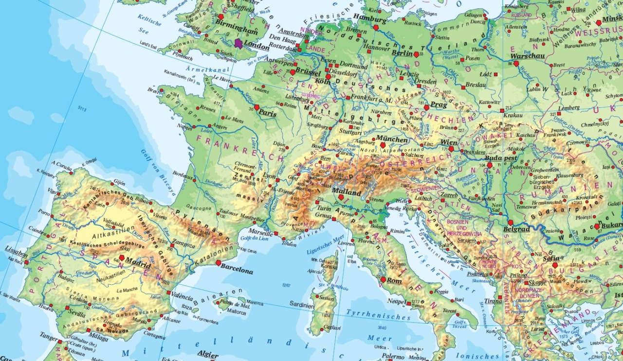 Im Gesamtbild fallen sofort die unterschiedlichen Flächenfarben auf. Die Blautöne grenzen das Meer vom Land ab, die Grüntöne markieren die Tiefländer und die Rotbrauntöne lassen die Gebirge optisch hervortreten. Eine schwarze Schummerung unterstützt die plastische Reliefenergie der Gebirge, sodass manch einer meinen könnte, der Boden unter sich wäre nicht völlig glatt und eben, sondern etwas aufgeraut und erhaben. Etwas in den Hintergrund geraten die violetten Staatsgrenzen und dünnen Schriftzüge für die Staatennamen. Zwischen den Staaten der Europäischen Union gibt es überhaupt nur dünne gerissene Grenzlinien. Schließlich ist es keine politische Karte und wir wünschen uns ja alle ein Europa ohne Innengrenzen …