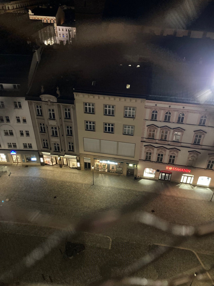 Nächtlicher Blick vom historischen Rathausturm auf das heutige Haus Nr. 8 mit einem Spezialgeschäft für mährischen Käse. Foto: L. Birsak, 2024