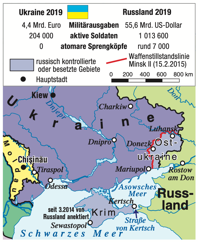 Eine aktuelle Karte aus dem Hölzel Verlag zeigt, welche Gebiete in der Ostukraine von Russland vor dem Krieg besetzt oder kontrolliert wurden. Die militärischen Zahlen zu aktiven Soldaten, Militärausgaben und Atomsprengköpfen stellen in Relation, wie ungleich dieser Kampf zwischen Russland und der Ukraine geführt wird.
