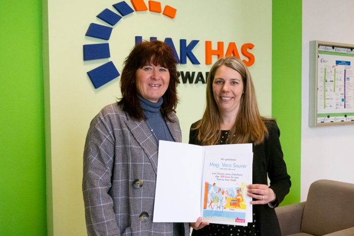 Die Lehrerin an der HAK Oberwart hat nicht nur alle Fragen unseres MANZ-Gewinnspiels richtig beantwortet, sondern wurde auch aus allen Teilnehmerinnen und Teilnehmern als Siegerin gezogen. Ergo durfte ihr Angelika Winter vom LehrerInnen-Service des MANZ Verlag Schulbuch persönlich den 300-Euro-Gutschein für einen Wellness-Aufenthalt überreichen.