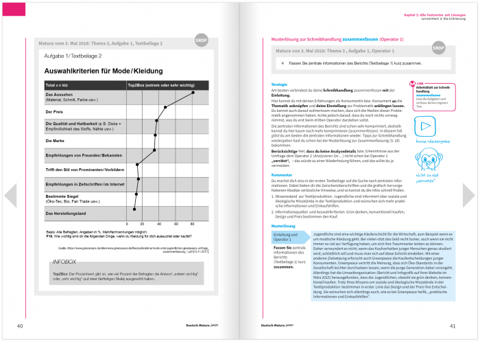 In der Online-Lernhilfe Deutsch-Matura jetzt! stehen nun – anhand der Matura vom 3. Mai 2018 – für die Textsorte Erörterung zu jedem einzelnen Operator die Erklärung der Schreibstrategie, ein Kommentar zum besseren Verständnis der Schreibhandlung und eine Musterlösung zur Verfügung. Am Ende der neuen Lerneinheit gibt es die Musterlösung für den gesamten Text.