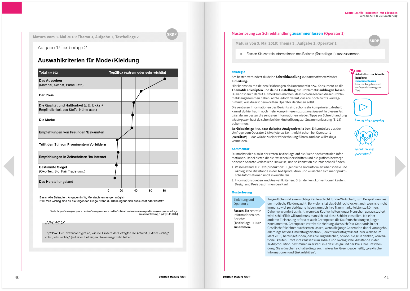 Deutsch-Matura jetzt! bietet nun anhand der Matura vom 3. Mai 2018 Musterlösungen zur Textsorte Erörterung – mit Checklisten, Textbausteinen und Lösungen zu jedem Operator.