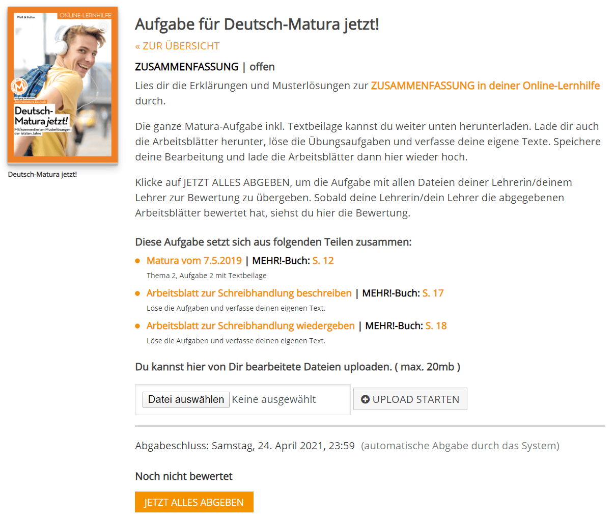 Mit den folgenden Aufgaben-Codes können Sie vorgefertigte Aufgaben zur Online-Lernhilfe Deutsch-Matura jetzt! in Ihre MEHR!-Kurse importieren.