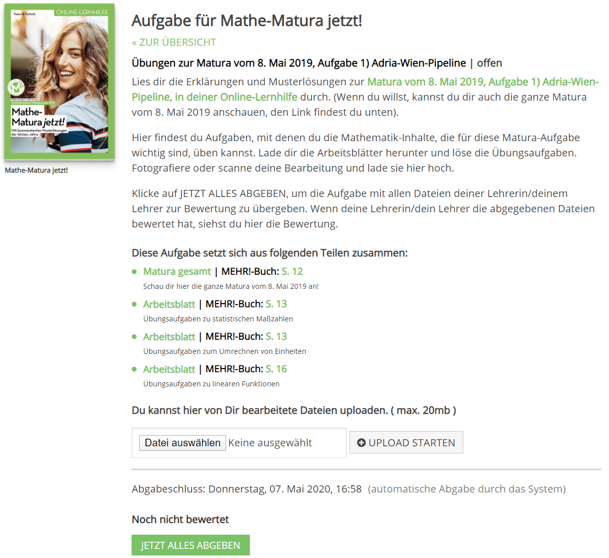 Mit den folgenden Aufgaben-Codes können Sie vorgefertigte Aufgaben zu den Online-Lernhilfen Deutsch-Matura jetzt! und Mathe-Matura jetzt! in Ihre MEHR!-Kurse importieren.