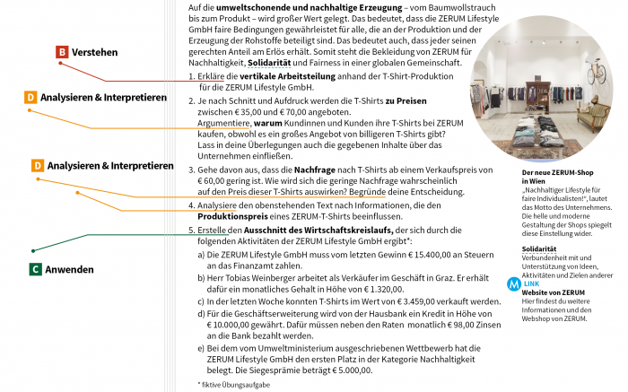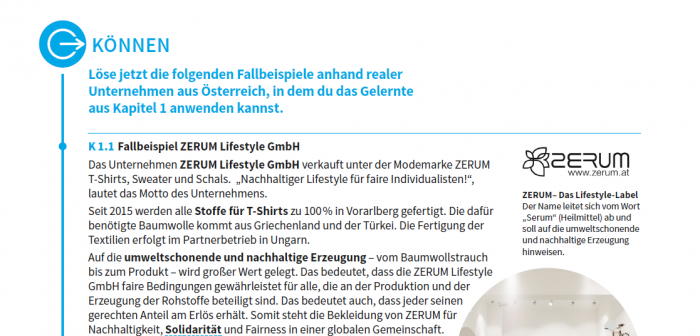 Fallbeispiele anhand realer Unternehmen in Österreich. Zum Beispiel mit ZERUM auf Seite 21 im M-BOOK Betriebswirtschaft HAK I.