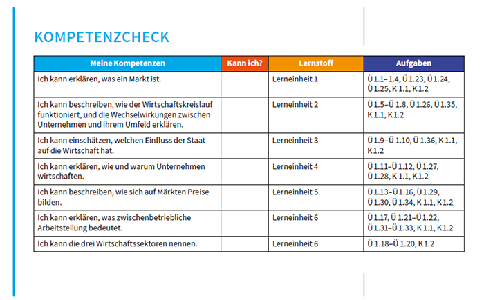 Am Ende jedes Kapitels findet sich ein Kompetenz-Check zur Selbstüberprüfung: Hier können die Schülerinnen und Schüler eintragen, welche Inhalte sie bereits beherrschen und welche sie noch üben müssen – die entsprechenden Übungen zu den einzelnen Themen sind gleich mit angegeben.