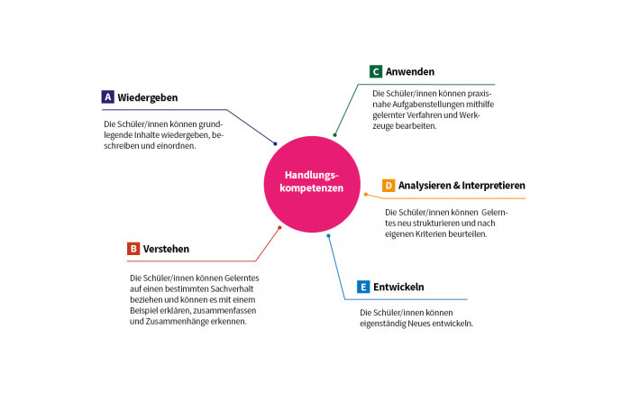 Um Sie bei ihrem kompetenzorientierten Unterricht zu unterstützen, sind sämtliche Aufgabenstellungen der Buch-Reihe auf insgesamt fünf Handlungsebenen ausgerichtet: