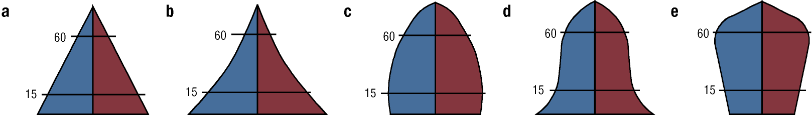 a) Pyramidenform; b) verbreiterte Pyramidenform; c) Bienenkorbform; d) Glockenform; e) Urnenform