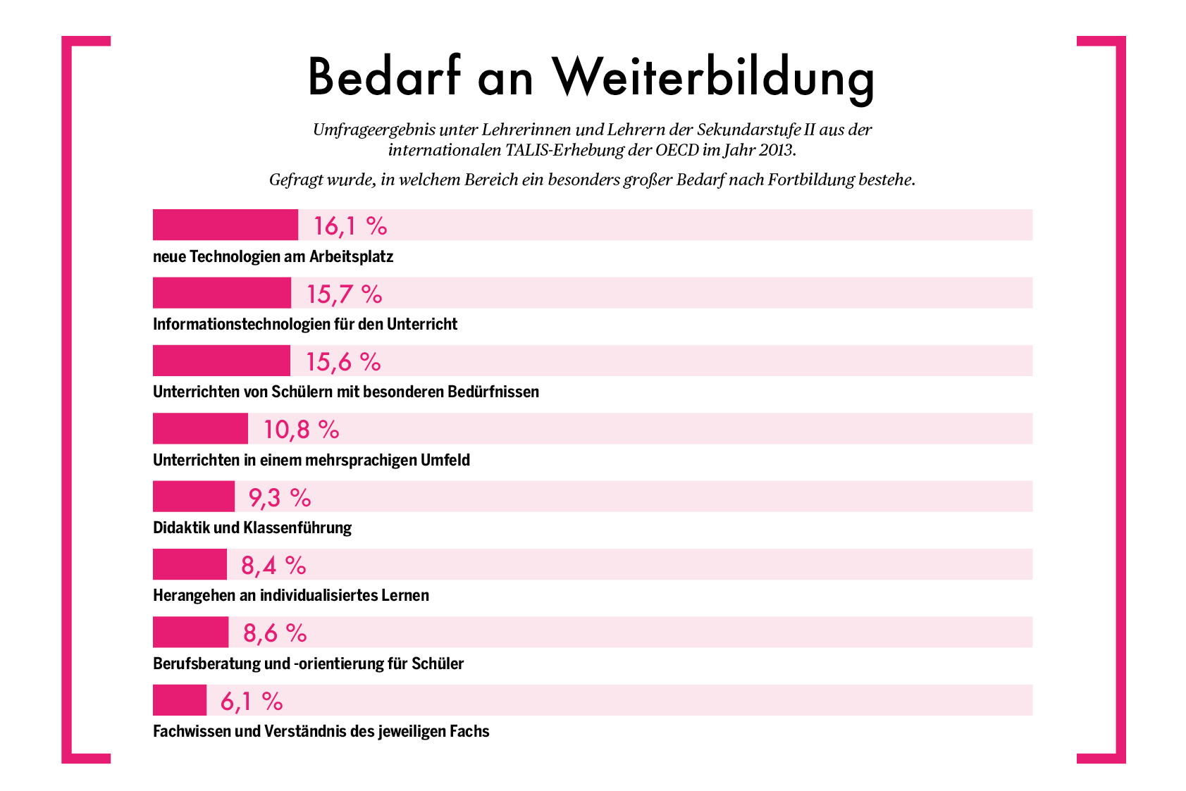 Das belegt auch ein Blick in die internationale OECD-Lehrerstudie TALIS aus dem Jahr 2013, in der auch jene Kompetenzen abgefragt wurden, in denen Pädagoginnen und Pädagogen für sich persönlich den größten Nachholbedarf sehen.