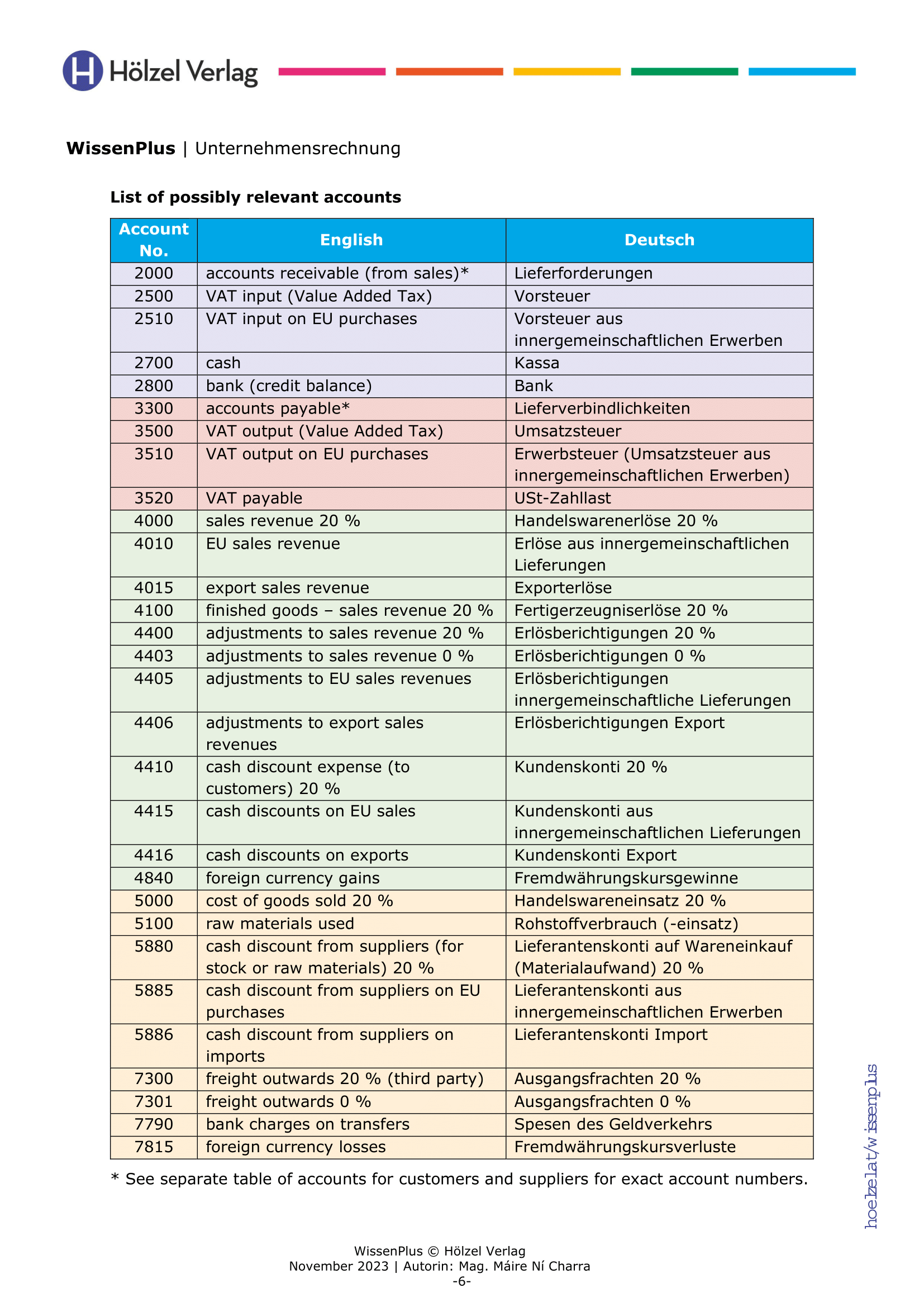 Diese kleine Case Study ist für den CLIL-Unterricht gedacht. Es wird vorausgesetzt, dass das Kapitel „Waren- und Zahlungsverkehr mit dem Ausland“ (Unternehmensrechnung HAK II, Kapitel 4) schon auf Deutsch durchgenommen wurde, dass die Grundlagen auch auf Englisch behandelt wurden und dass die Schülerinnen und Schüler ausreichend Englisch können, um ausschließlich auf Englisch zu arbeiten. Die Belege müssen auf ihre Richtigkeit überprüft und eventuell berichtigt werden (Unternehmensrechnung HAK I, Kapitel 3, Lerneinheit 4). Es wird in Fremdwährungen gekauft, verkauft und schließlich bezahlt, inklusive Skontoabzug. Das heißt, dass alle Basisbuchungen aus Unternehmensrechnung HAK I und II vorausgesetzt werden.