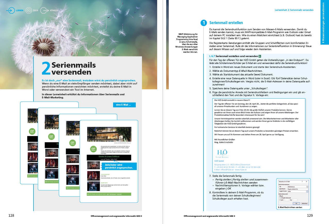 Abb. 2: Kompakt aufbereiteten Unterrichtsstoff zu Serienmails samt Übungsbeispielen finden sich in den 2er-Bänden der OMAI- und AIM-Reihen des Hölzel Verlags für HAK, HAS, HLW, FW, HLT und FS Pflegevorbereitung.