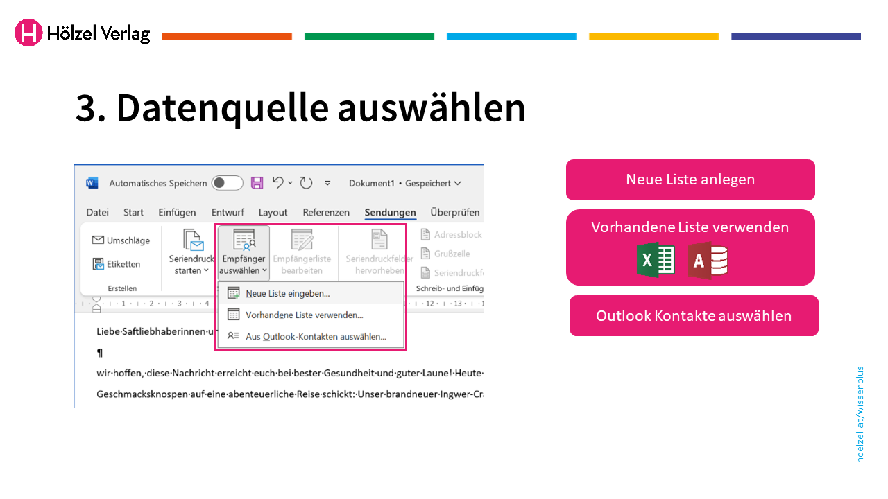 Abb. 1: Die Serienmail- bzw. Seriendruck-Funktion bietet mehrere Möglichkeiten, die Empfänger/innen des Serienmails anzugeben.