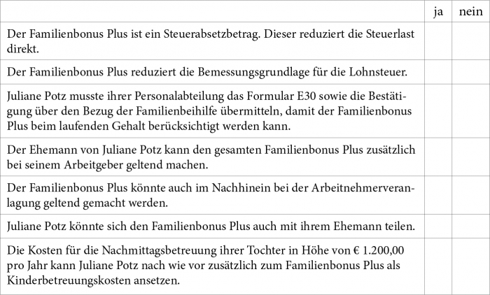 Während Jutta Helm keine Kinder hat, ist Juliane Potz Mutter einer 14-jährigen Tochter. Juliane Potz hat mit ihrem Mann vereinbart, dass sie den gesamten Familienbonus Plus bei ihrem laufenden Gehalt berücksichtigen soll.