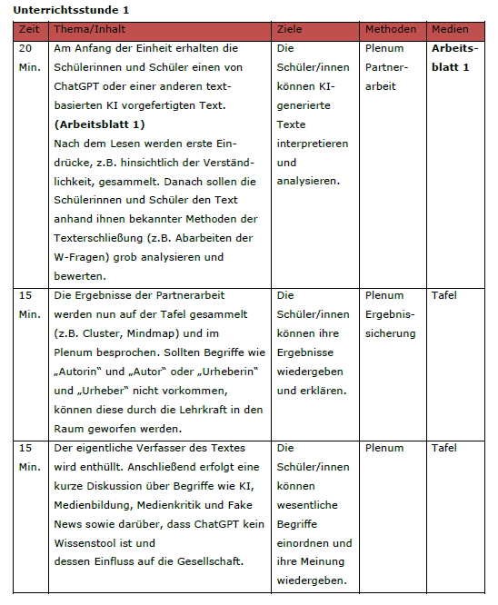- In der ersten Unterrichtseinheit werden die Schülerinnen und Schüler durch einen von ChatGPT generierten Text an die Thematik herangeführt. Außerdem werden wichtige Begrifflichkeiten wie Medienbildung, Medienkritik und Fake News angesprochen.