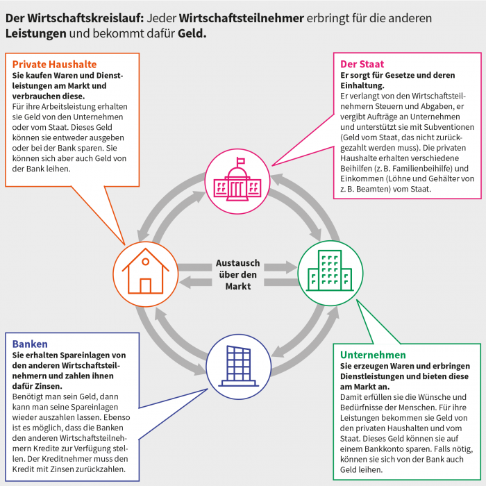 Um das Schaubild „Wirtschaftskreislauf“ verstehen zu können, müssen die Schülerinnen und Schüler in einem ersten Schritt die darin enthaltenen kontinuierlichen und diskontinuierlichen Elemente wahrnehmen.