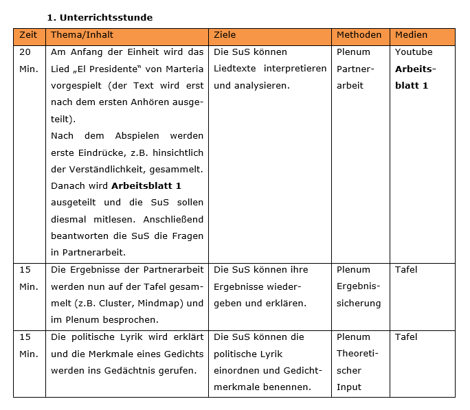 • In der ersten Unterrichtseinheit werden die Schülerinnen und Schüler durch einen aktuellen Liedtext an die politische Lyrik herangeführt und diese wird näher erläutert. Zusätzlich sollen die Schülerinnen und Schüler einen Vergleich zwischen Lyrik und Musik ziehen und erkennen, dass sie gemeinsame Merkmale teilen.