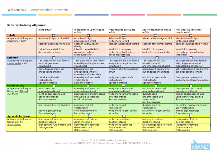Den gesamten Beitrag zum Download inklusive Kriterienkataloge, Mustertexte und Lösungen finden Sie im MANZ Online-Lehrerzimmer unter WISSENPLUS.