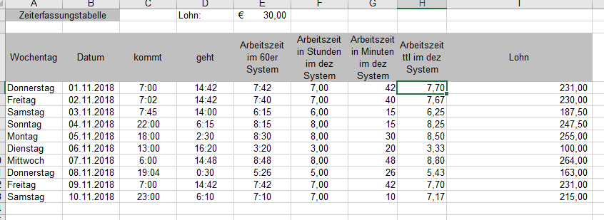 Ein Arbeiter möchte mit Excel seine Arbeitszeiten erfassen. Dazu trägt er jeden Tag ein, wann er kommt und geht. Auf dem Tabellenblatt soll berechnet werden, welchen Lohn er für seine Arbeitszeit erhält: