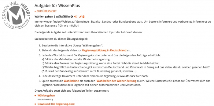 Die Aufgabe zu „Wählen gehen“ nach dem Import in einen MEHR!-Kurs (Ansicht für Lehrer/innen)
