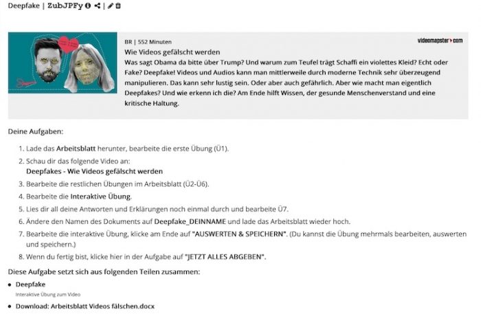 Die Aufgabe zu „Deepfakes“ nach dem Import in einen MEHR!-Kurs (Ansicht für Lehrer/innen)