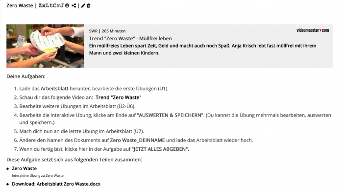 Die Aufgabe zu „Zero Waste“ nach dem Import in einen MEHR!-Kurs (Ansicht für Lehrer/innen)